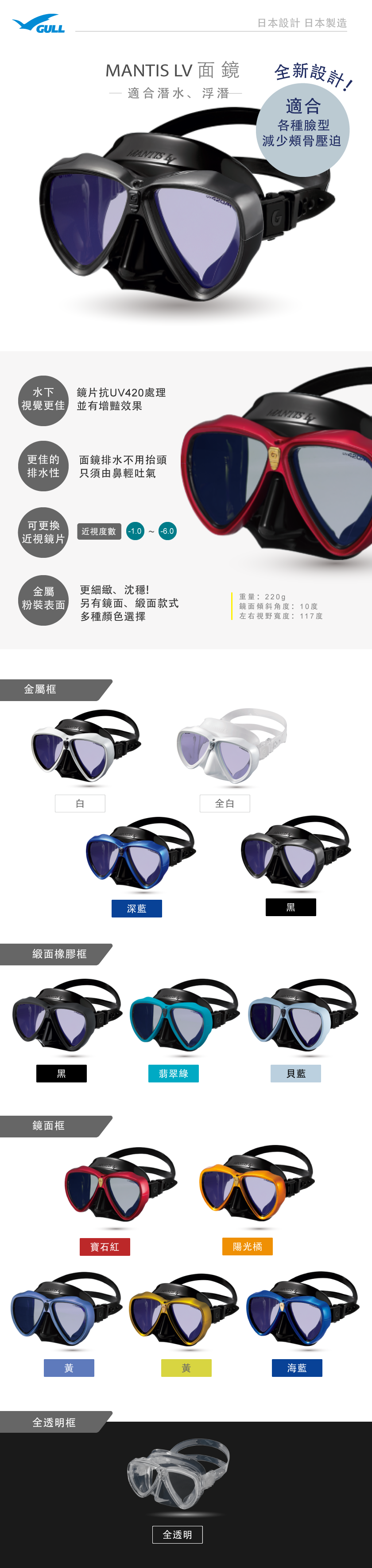 - 鏡片抗UV420處理,並有增豔效果,水下視覺更佳