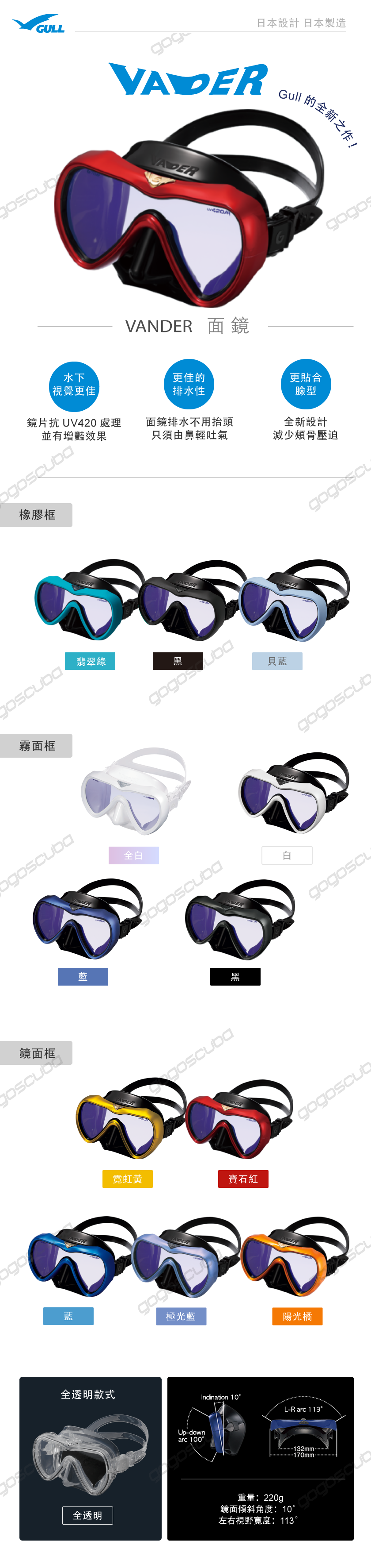 - 鏡片抗UV420處理,並有增豔效果,水下視覺更佳