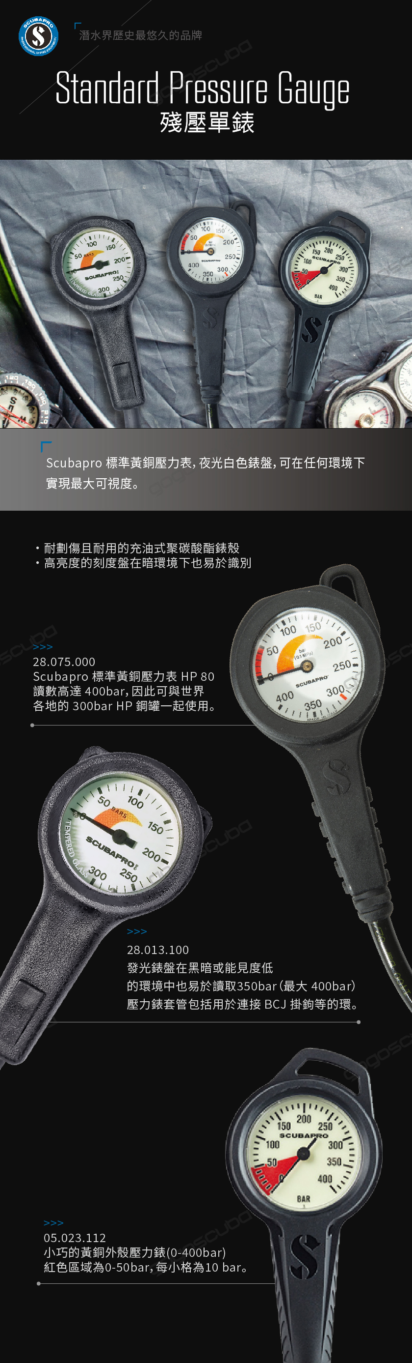 Scubapro 標準黃銅壓力表 HP 80 讀數高達 400bar,因此可與世界各地的 300bar HP 鋼罐一起使用。