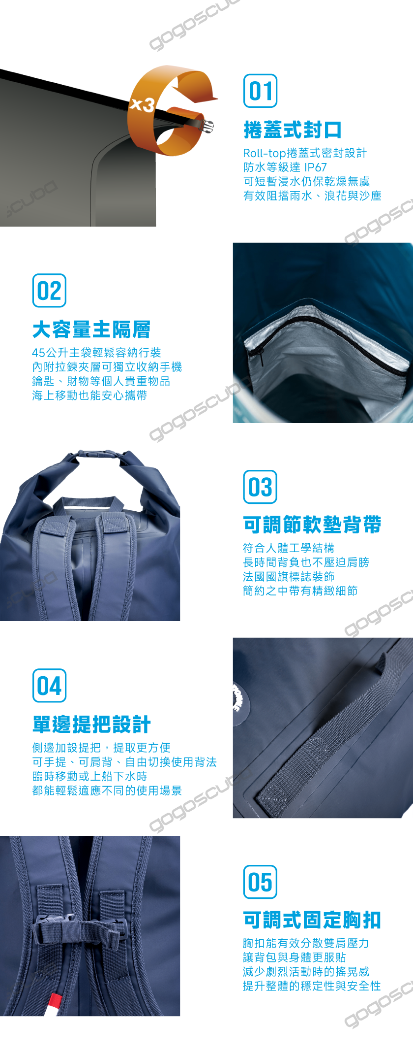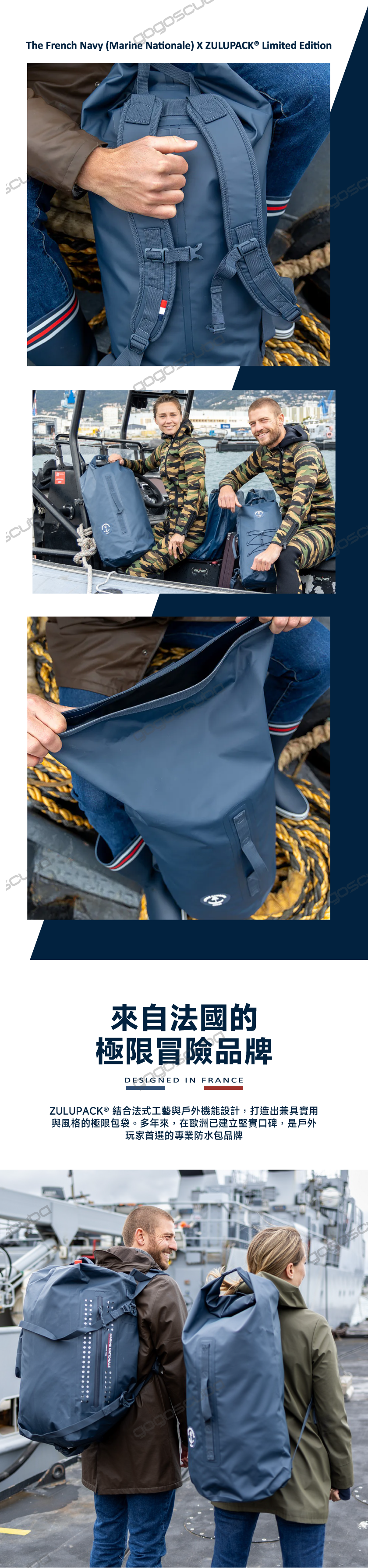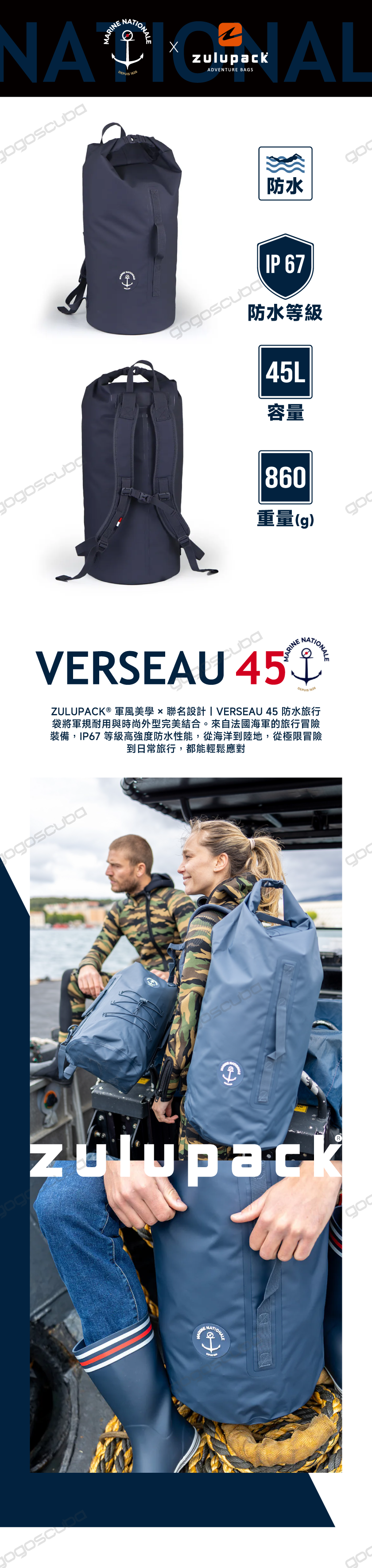 VERSEAU 45L 是法國海軍和ZULUPACK的指定聯乘作品, 無論是划槳、越野爬山、騎摩托車或旅行,VERSEAU 45L 背包都是您的理想伴侶。 提供卓越的防水防沙保護,確保您的貴重物品安全無憂。背包採用鎖扣和靈活的三折式閉合設計,達到IP67防水級別,便於安全存放潛水和船用設備。