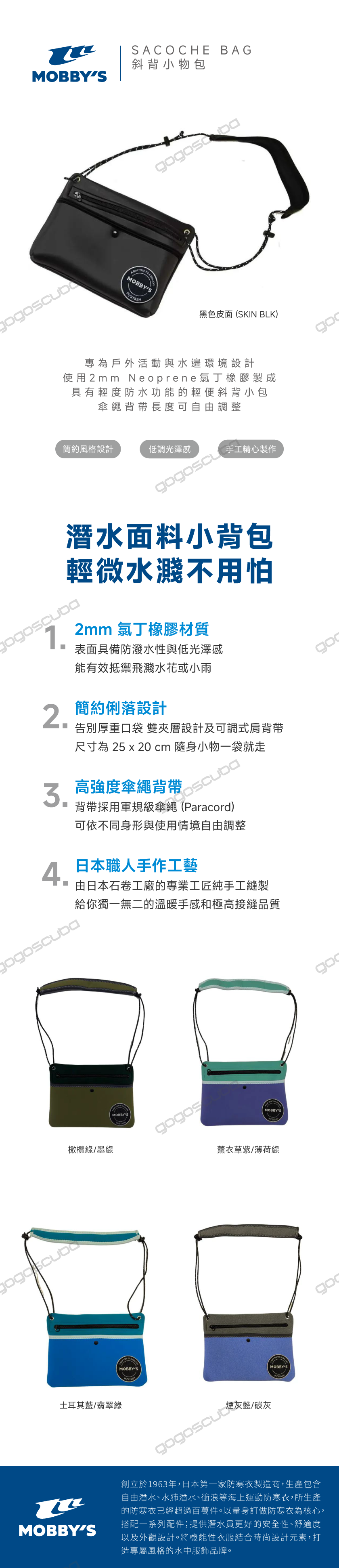 隨身側背小包,採用防寒衣材質製成,表層稍微弄濕也不擔心,為 MOBBY'S原廠職人手工製作。
