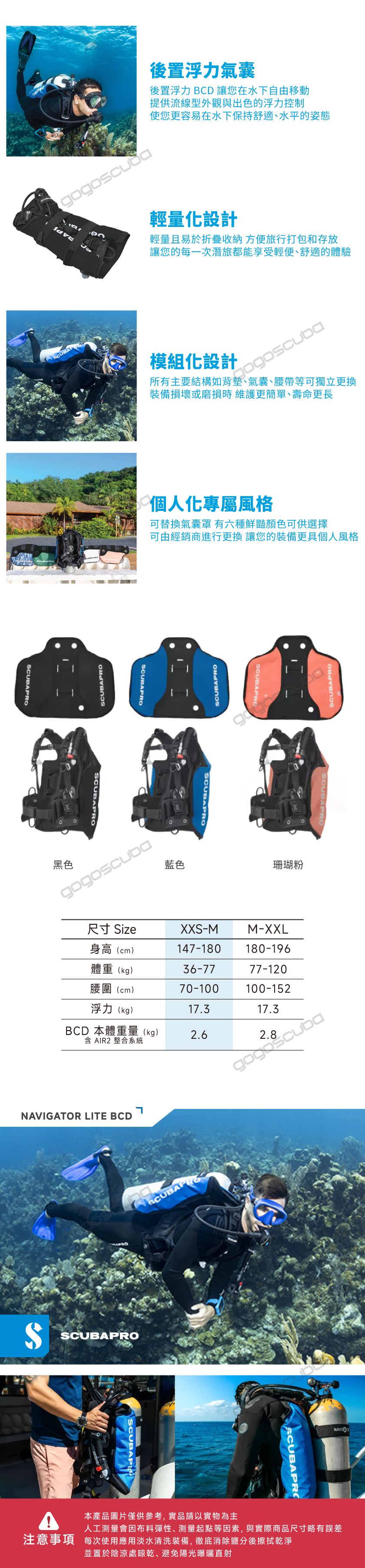 • 是偏好背囊浮力且熱衷於色彩客製化潛水裝備的休閒潛水旅人之理想裝備。