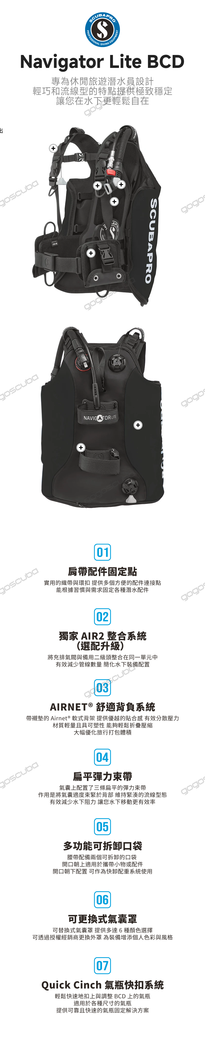 SCUBAPRO 全新推出的 Navigator Lite 是一款輕量化的背飛式BCD,它完美契合了偏好背囊浮力、追求簡約耐用設計,並渴望透過