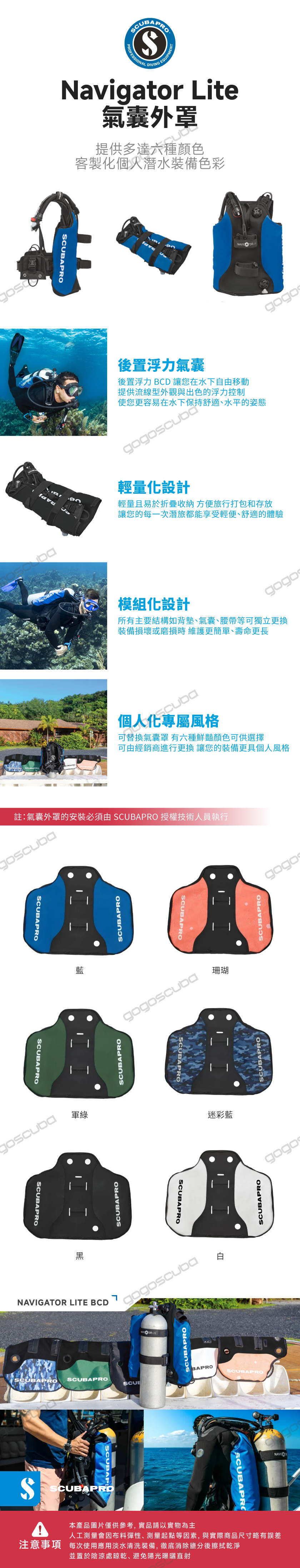 人潛水裝備色彩。(註:氣囊外罩的安裝必須由 SCUBAPRO 授權技術人員執行)。
