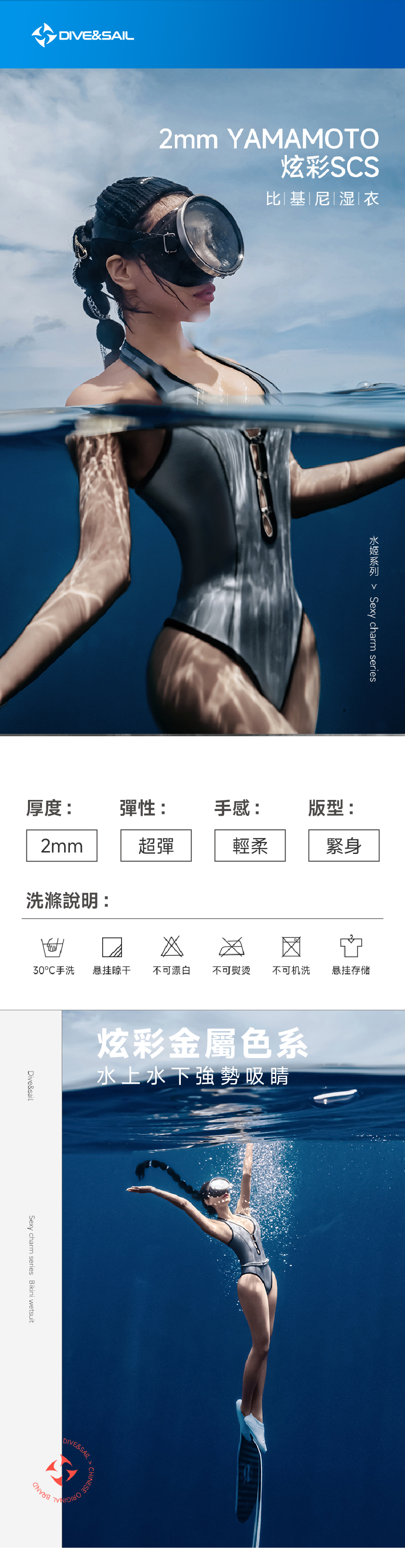 潛水服不可洗衣機洗滌和脫水烘乾等,請勿使用熨斗熨燙和漂白劑漂白。