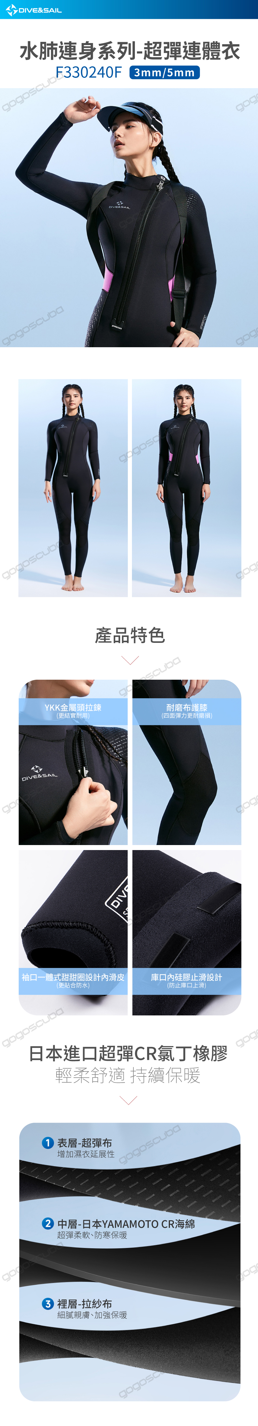 3MM超彈CR盲縫前斜開防寒衣(女)