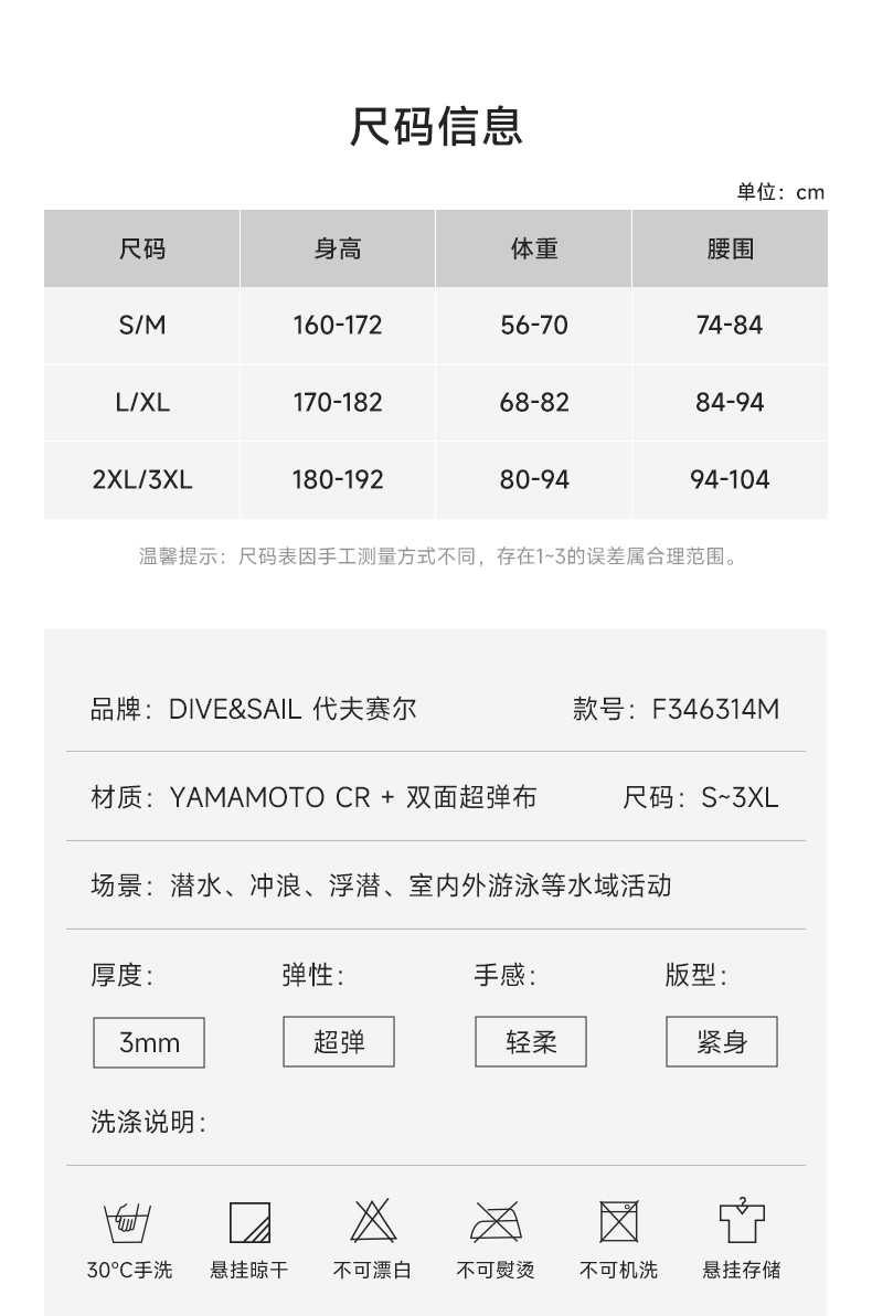 5. 潛水服不可洗衣機洗滌和脫水烘乾等,請勿使用熨斗熨燙和漂白劑漂白。