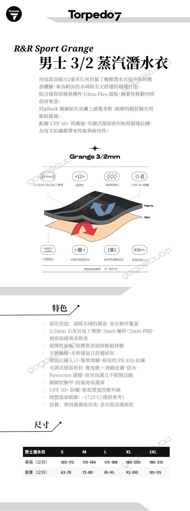 - 3/2mm 石灰岩氯丁橡膠,3mm 軀幹,2mm 四肢,提供保暖與柔軟度