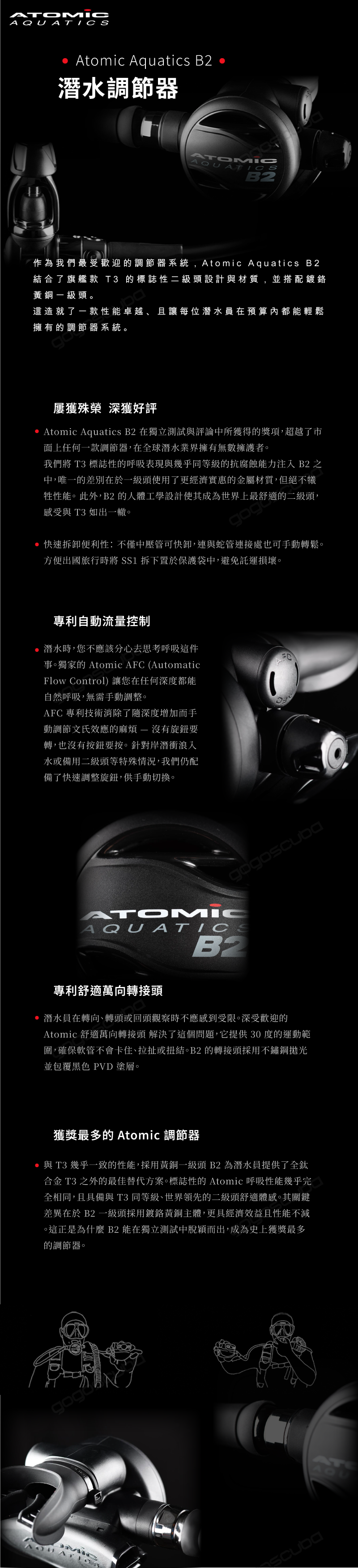 性能幾乎與T3搭配黃銅第一級的版本相同B2 為潛水員提供了與全鈦合金 T3 相當接近的選擇。Atomic 的標誌性呼吸表現幾乎一模一樣。B2 在人體工學上被設計成世界上最舒適的第二級,就像 T3 一樣。主要差異在於B2第一級採用鍍鉻黃銅機身,在性能不犧牲的前提下更為經濟。這也是為什麼B2在獨立測試和審查中獲得的獎項比市場上任何其他監管機構都多。