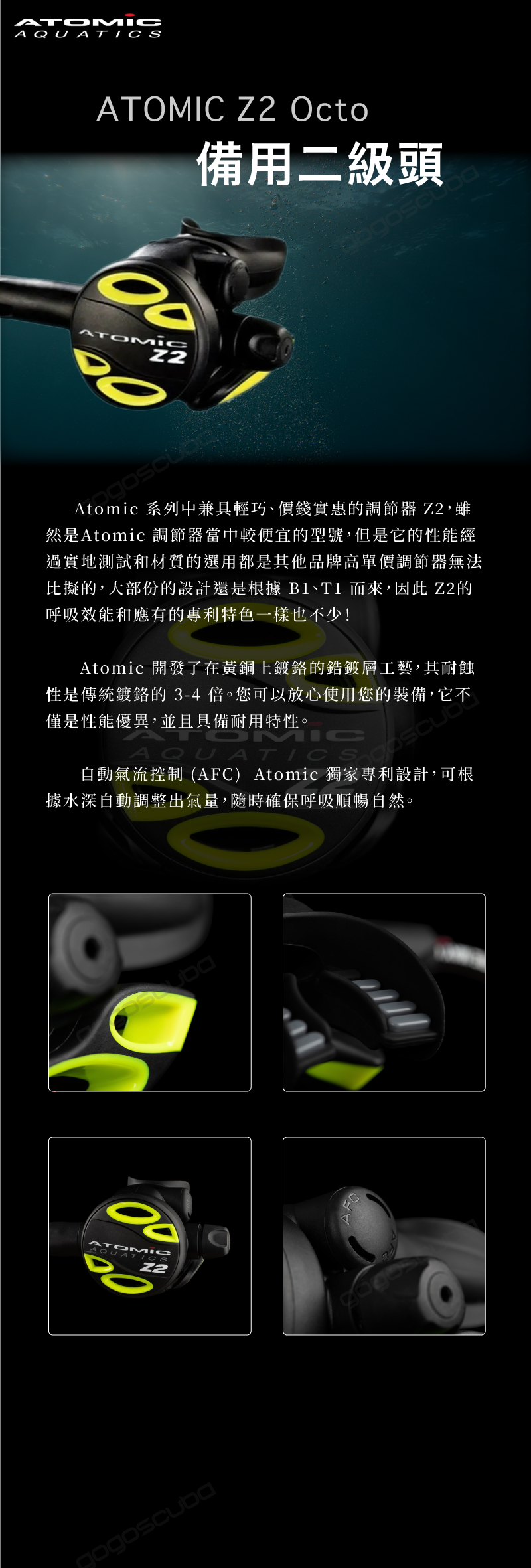 Atomic系列中兼具輕巧、價錢實惠的調節器Z2,雖然是Atomic調節器當中較便宜的型號,但是它的性能經過實地測試和材質的選用都是其他品牌高單價調節器無法比擬的,大部份的設計還是根據B1、T1而來,因此Z2的呼吸效能和應有的專利特色一樣也不少!