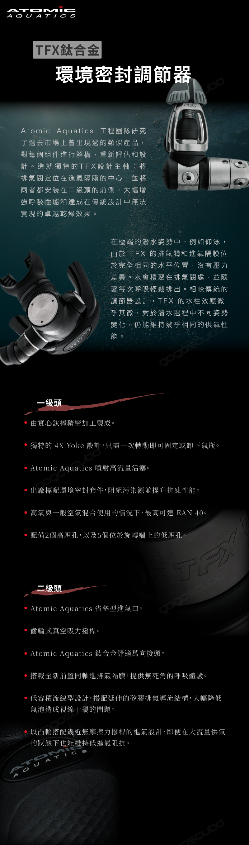 Atomic Aquatics 工程團隊研究了過去市場上曾出現通的類似產品,對每個組件進行解構,重新評估和設計。造就獨特的TFX設計主轴-將排氣閱定位在進氣隔膜的中心,並將兩者都安裝在二級頭的前側,大幅增強呼吸性能和達成在傅统設計中無法實現的卓越乾燥效果·
