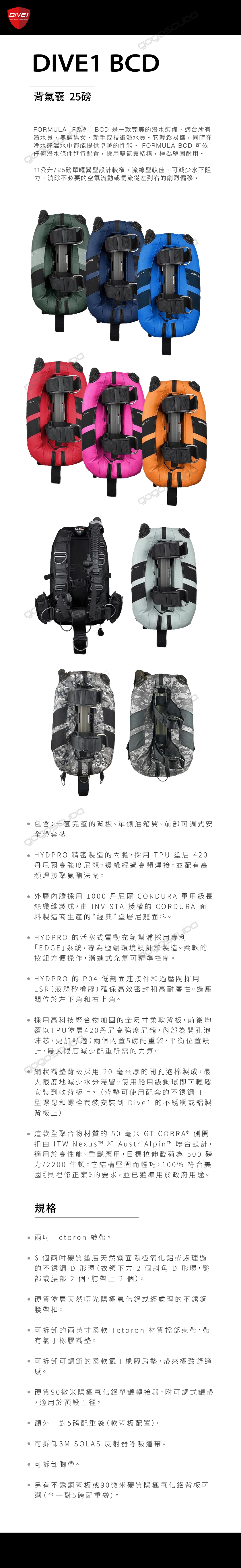 DIVE1 背囊式BCD 25磅 (軟背板.鋁背板.碳纖背板)