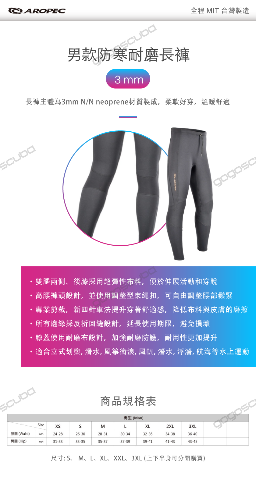- 長褲主體為3mm N/N neoprene材質製成,柔軟好穿,溫暖舒適